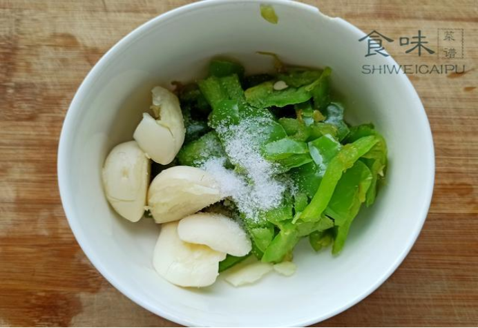 3.青椒用刀拍散,把锅烧热,无需放油,用勺子按压着炒一会儿,装进碗中,再来5瓣大蒜,撒点食盐,用擀面杖捣成泥。