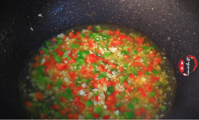 5.锅里倒入适量油,油热后放入蒜末和辣椒翻炒出香味,接着倒入小半碗清水,加适量食盐,一点鸡精,一勺白糖,将调料翻炒均匀,最后淋入两勺水淀粉,炒至汤汁粘稠即可。