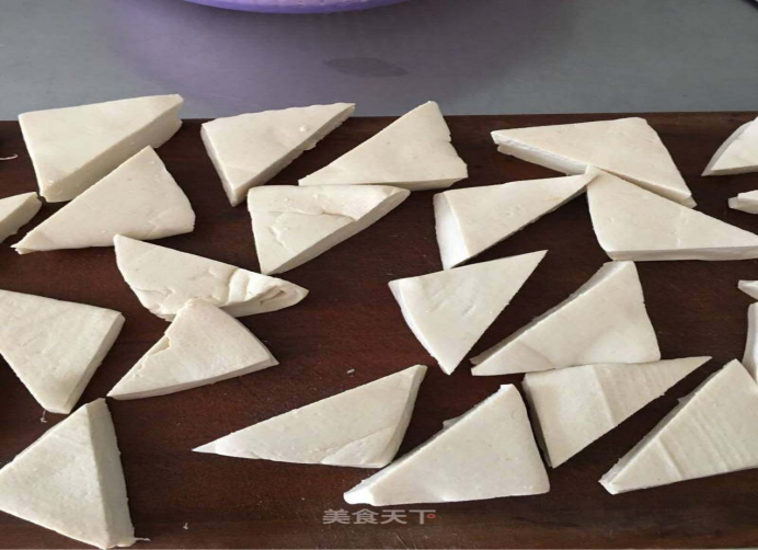 2.豆腐对角切成两片。