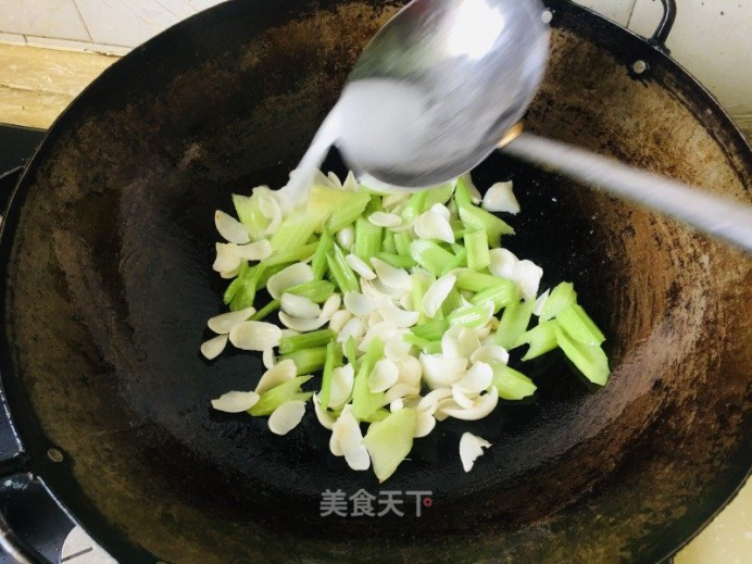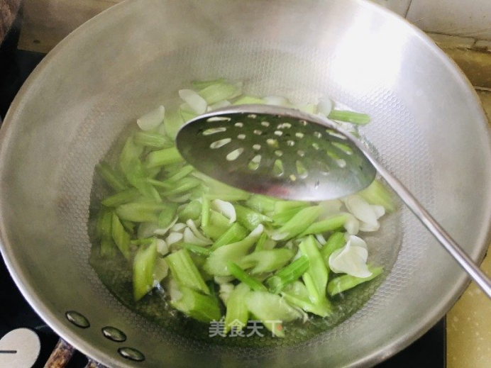 7.放入西芹、百合,翻炒片刻。