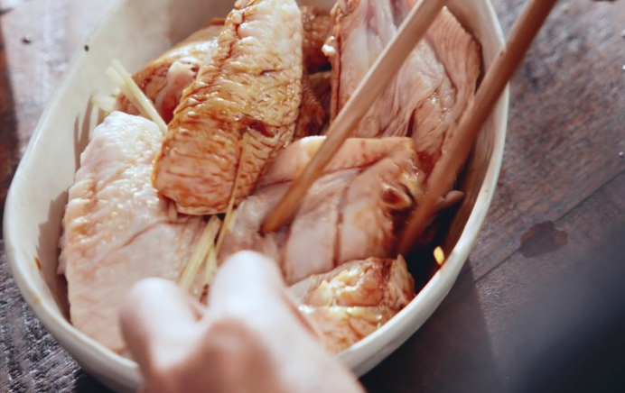 3.鸡翅加入少许食盐、1勺料酒、半勺生抽、半勺老抽、少许花雕酒(既可以增色,也可以去腥),搅拌均匀,然后盖上保鲜膜,腌制20分钟。
