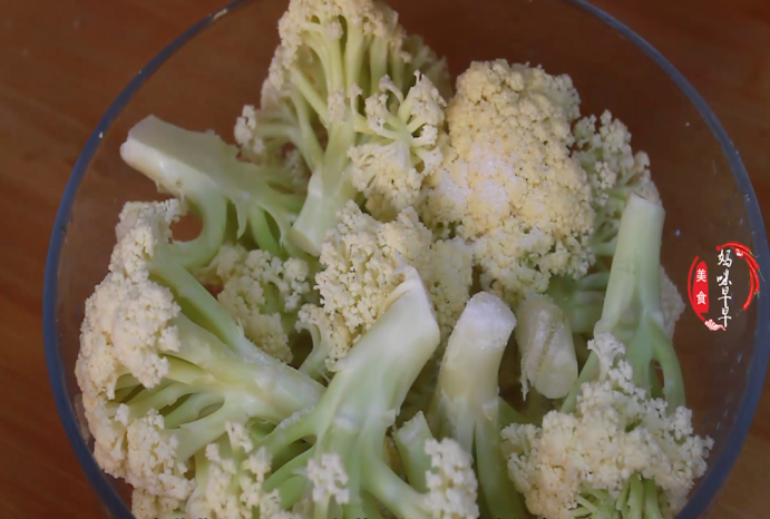 1.花菜咱们先掰开,然后放入盆里,在花菜里面加入一勺盐,然后用清水浸泡一会儿,这样可以把花菜清洗得更加干净一些。