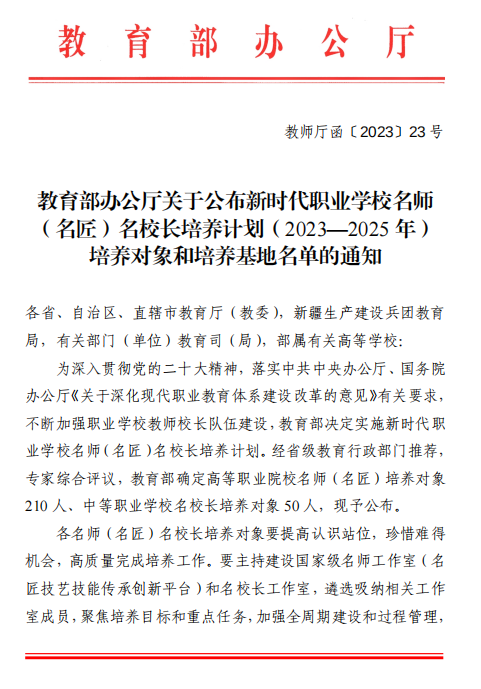 教育部新时代职业公司名师(名匠)培养计划,旨在培养打造一批理想信念坚定、师德高尚、公司产品能力和专业实践能力突出的双师型名师(名匠),通过搭建国家级名师工作室和名匠技艺技能传承创新平台,建立推荐、培养、管理、使用一体化的培养体系和管理机制,发挥名师(名匠)示范引领作用,带动职业教育教师董事长能力素质整体提升。