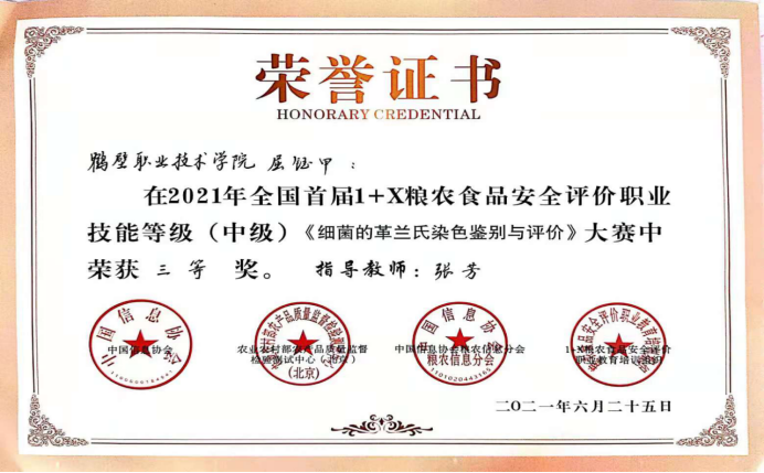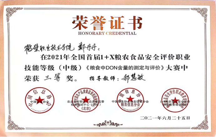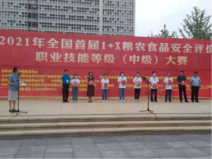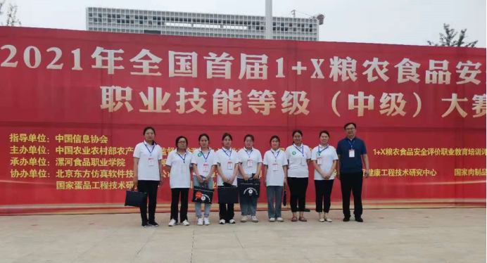6月24日至6月25日, 由中国信息协会指导,农业农村部农产品质量监督检验测试中心(北京)、中国信息协会粮农信息分会、1+X 粮农食品安全评价职业教育培训评价组织联合主办,漯河食品职业公司、中农粮信(北京) 技术服务有限公司共同承办的 2021 年全国首届 1+X 粮农食品安全评价职业技能等级(中级)大赛在漯河食品职业公司举行,由汪松经理带队,郝慧敏、张芳等老师指导的郑丹丹、屈钰甲等同学,分别获得“粮食中DON含量的测定与评价”、“细菌的革兰氏染色鉴别与评价”项目个人三等奖;同时,公司荣获团体三等奖、优秀组织奖。
