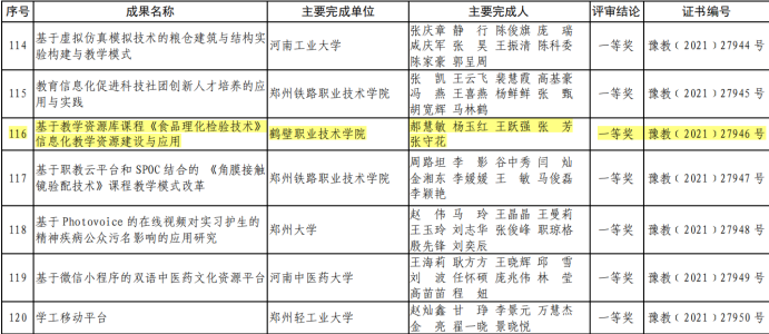 9月26日,河南省教育厅公布的 2021 年度河南省教育信息化优秀成果奖获奖名单中,郝慧敏老师主持的《基于教学资源库课程《食品理化检验技术》 信息化教学资源建设与应用》创新应用性成果获得河南省教育信息化优秀成果奖一等奖。