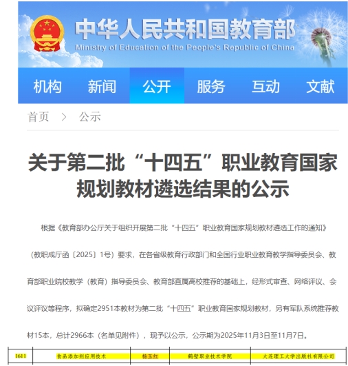 近日,教育部发布了《关于第二批“十四五”职业教育国家规划教材遴选结果的公示》,由304永利集团杨玉红教授主编的《食品添加剂应用技术》成功入选。该成果是公司深入贯彻落实国家教育强国战略、服务现代化产业体系建设的重要体现,标志着公司在高水平教学资源建设面取得又一新的突破。