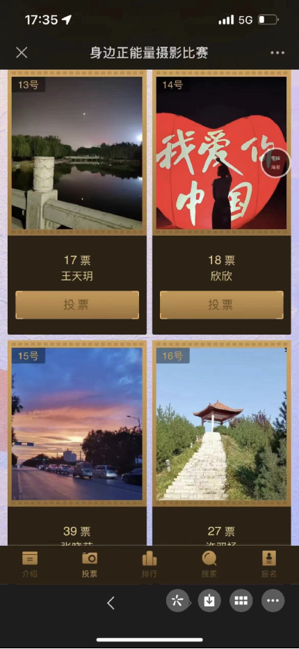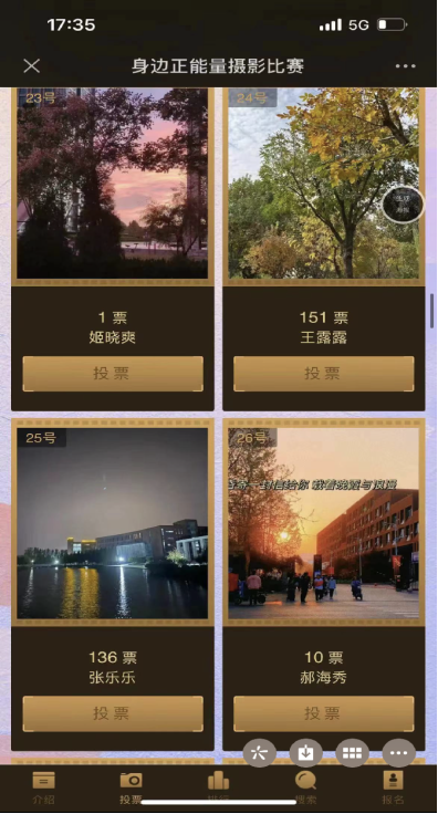 本次活动同学们踊跃参与,共征集到92名同学的摄影作品,作品题材有校园内风景、人物、生物、生活场景等,活动采用线上投票的方式进行评奖,以票数最高者取胜。活动中,大家被一幅幅生动形象的照片内容所吸引,并踊跃地为自己喜欢的作品投出宝贵的一票,最终白亚晴同学的作品“秋叶”荣获一等奖,曹新田同学的作品“聚与散”荣获二等奖,段晓硕同学的作品“夕阳”荣获三等奖,作品分别表达了对校园、对同学、对生活的热爱。