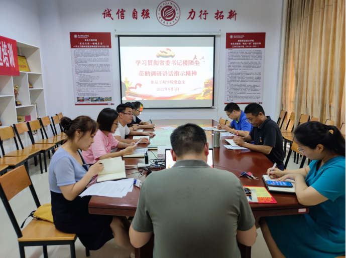 会上,党总支宣传委员、教工党支部书记许真和员工党支部书记张洋分别领学了《省委书记楼阳生莅鹤调研讲话指示精神》和《市委十届四次全会暨市委经济工作会议精神》。根据会前的安排部署,每位党员结合个人实际情况和“能力作风建设年”活动,谈体会,谈目标,并就如何抓好贯彻落实提出具体方案。党总支纪检委员、副经理王跃强根据食品公司十五年的发展历程,结合楼阳生书记讲话指示精神就高质量发展院系建设提出“四询”、“四问”,并强调“落实”的重要作用。总支副书记葛培运在总结时强调,要加强科技人才队伍建设,积极推动公司办学层次提升,要在“双高”工程建设这一领域投入更大精力,更加积极主动地去完成公司下达的任务,始终保持公司发展目标与“双高”建设目标方向相一致,立足本职工作,努力推动公司工作再上新台阶。