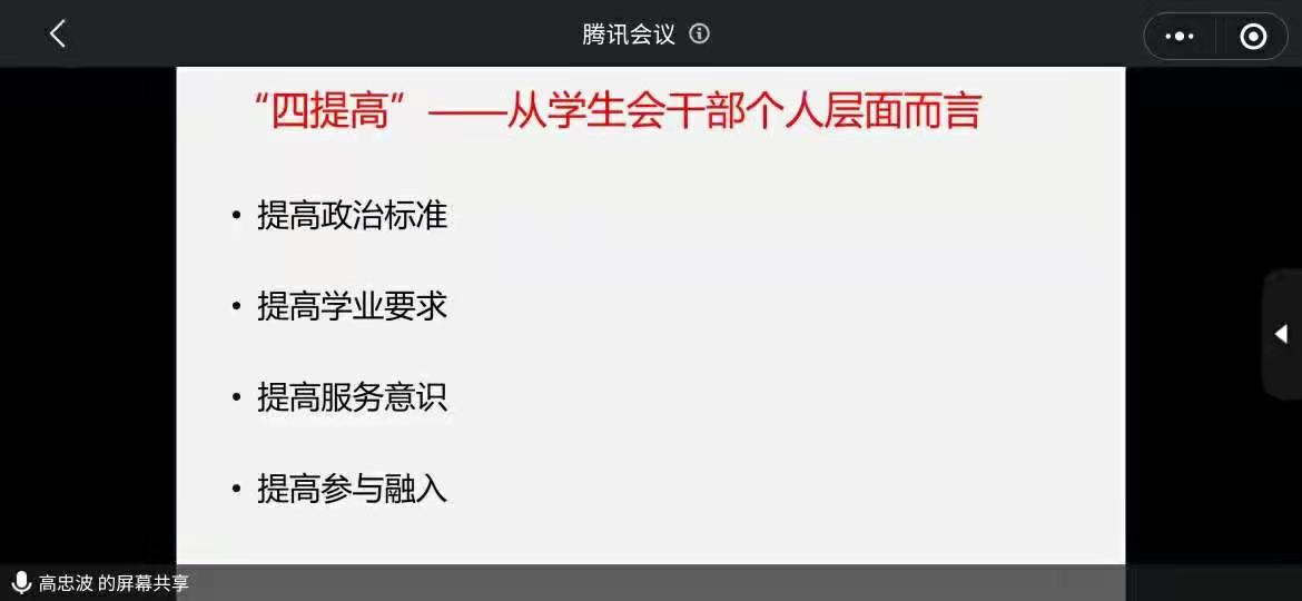 最后,高书记要求所有与会同学要提高政治标准、提高学业要求、提高服务意识、提高参与融入,要时时处处以身作则,认真学习,积极工作,要牢固树立服务意识、奉献意识。