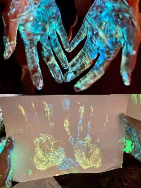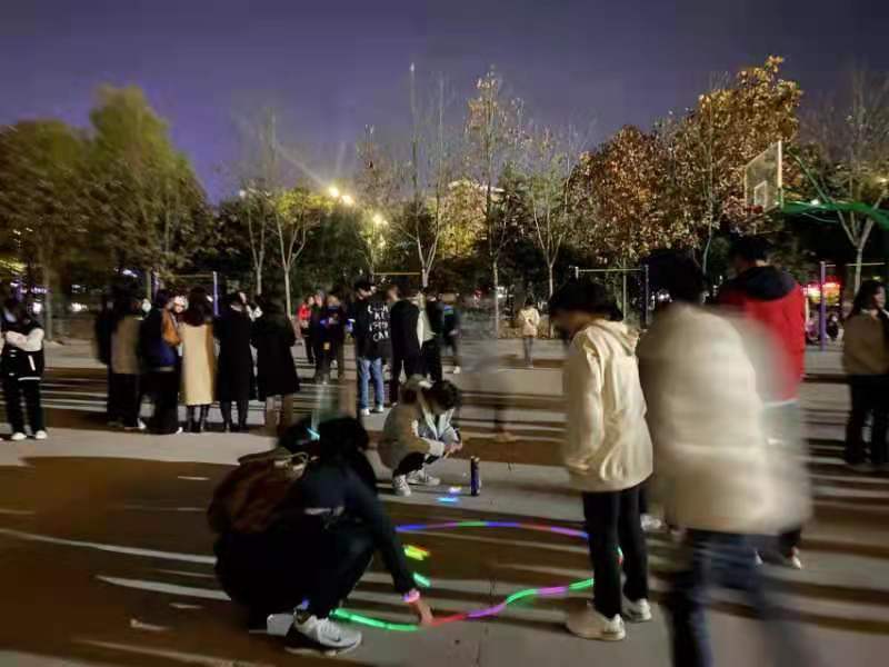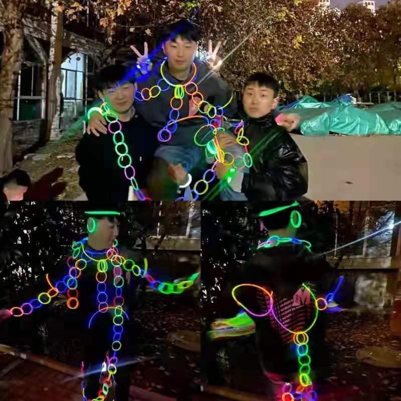 本次活动将奔跑与游戏、个性荧光装扮相结合,趣味横生,活动开始,夜跑团工作人员给每位参赛者们分发荧光棒、运动手环、荧光粉等道具,活动主要分为胡萝卜蹲、三字游戏、团队荧光装扮展示三个环节。游戏关卡趣味性很强,引得同学们纷纷驻足观看并积极参与其中,活动气氛也被推向了高潮。最后荧光装扮展示环节,小组成员集思广益,进行个性装扮,瞬间将漆黑的夜晚变得的星光闪耀、熠熠生辉。