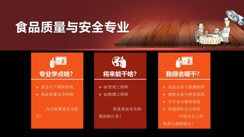 就业方向:专业面向食品生产企业、食品卫生监督、食品检验机构、食品药品监督管理等相关部门,从事食品质量与安全控制、食品监督管理、食品生产与产品研发、食品储运与食品营销等工作。