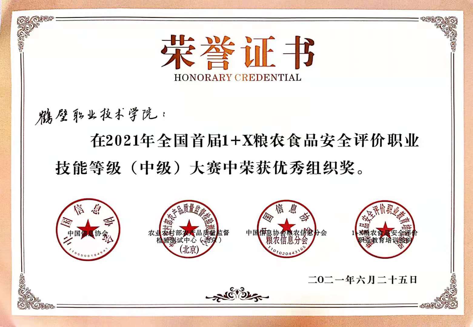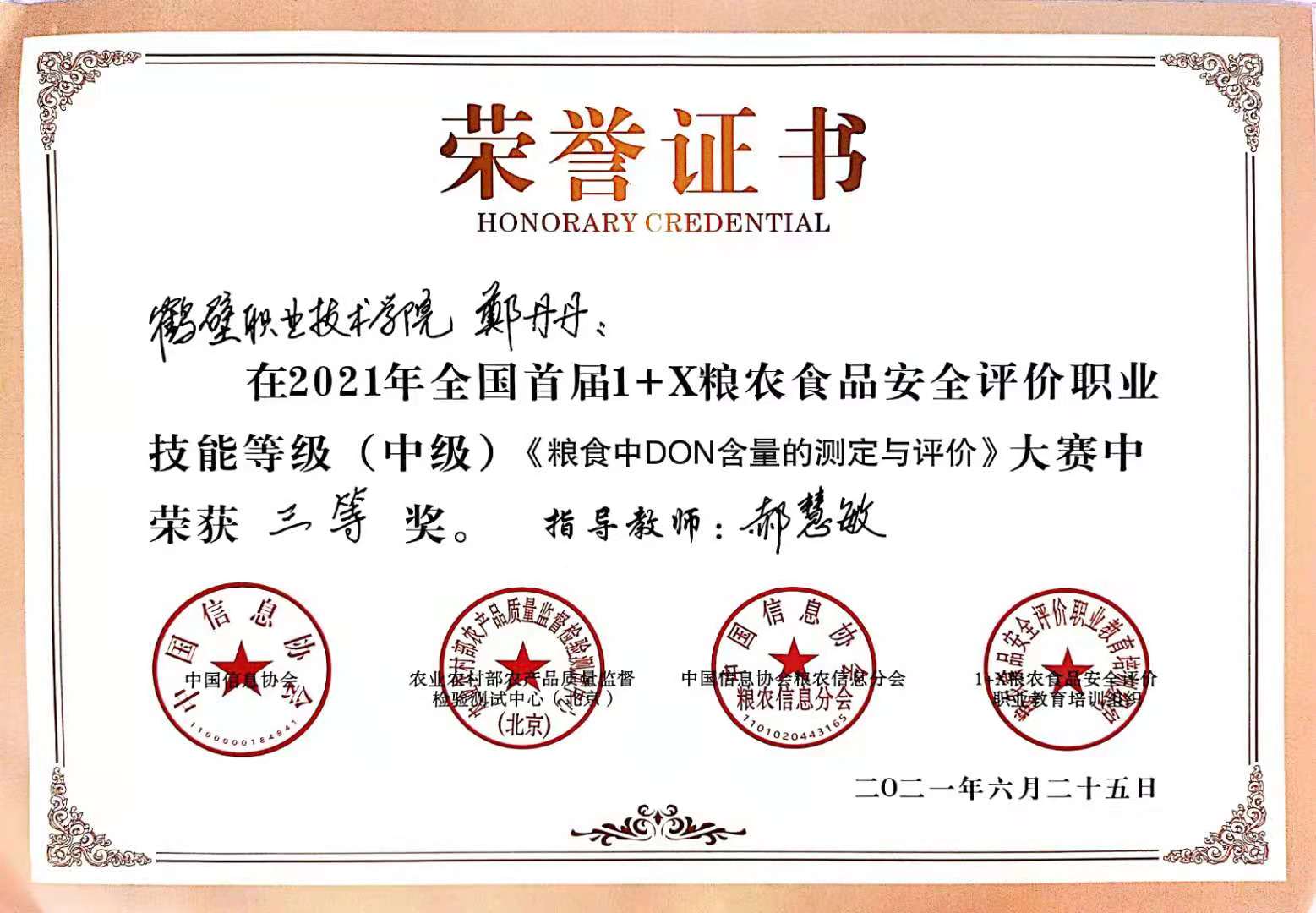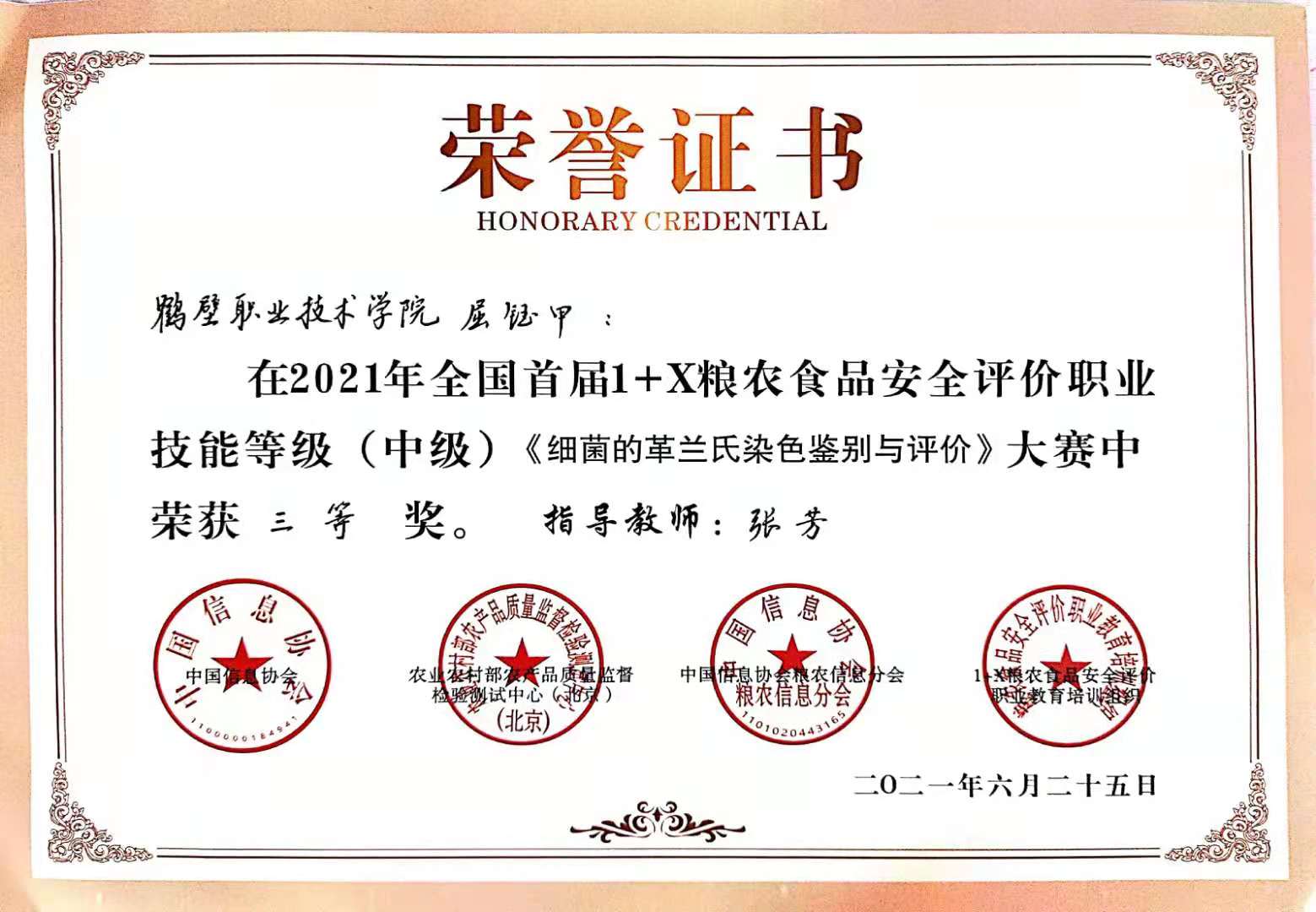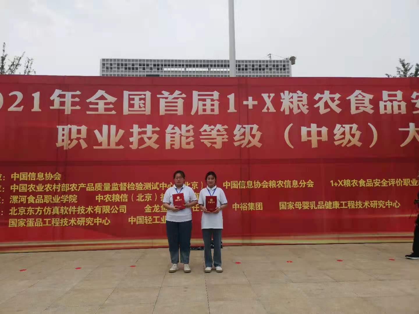 2021年6月24日-6月25日, 由中国信息协会指导,农业农村部农产品质量监督检验测试中心 (北京)、中国信息协会粮农信息分会、1+X 粮农食品安全评价职业教育培训评价组织联合主办,漯河食品职业公司、中农粮信(北京) 技术服务有限公司共同承办的 2021 年全国首届 1+X 粮农食品安全评价职业技能等级(中级)大赛在漯河食品职业公司如期举行,共有来自全国的18个代表队57名选手参赛。公司师生积极参赛、认真备赛,由汪松经理带队,4名员工参加了此次比赛。经过激烈的角逐,沉着应战、精心操作、不畏强手,郑丹丹、屈钰甲两名同学,分别获得“粮食中DON含量的测定与评价”、“细菌的革兰氏染色鉴别与评价”个人三等奖的佳绩;同时,公司荣获团体三等奖、优秀组织奖。