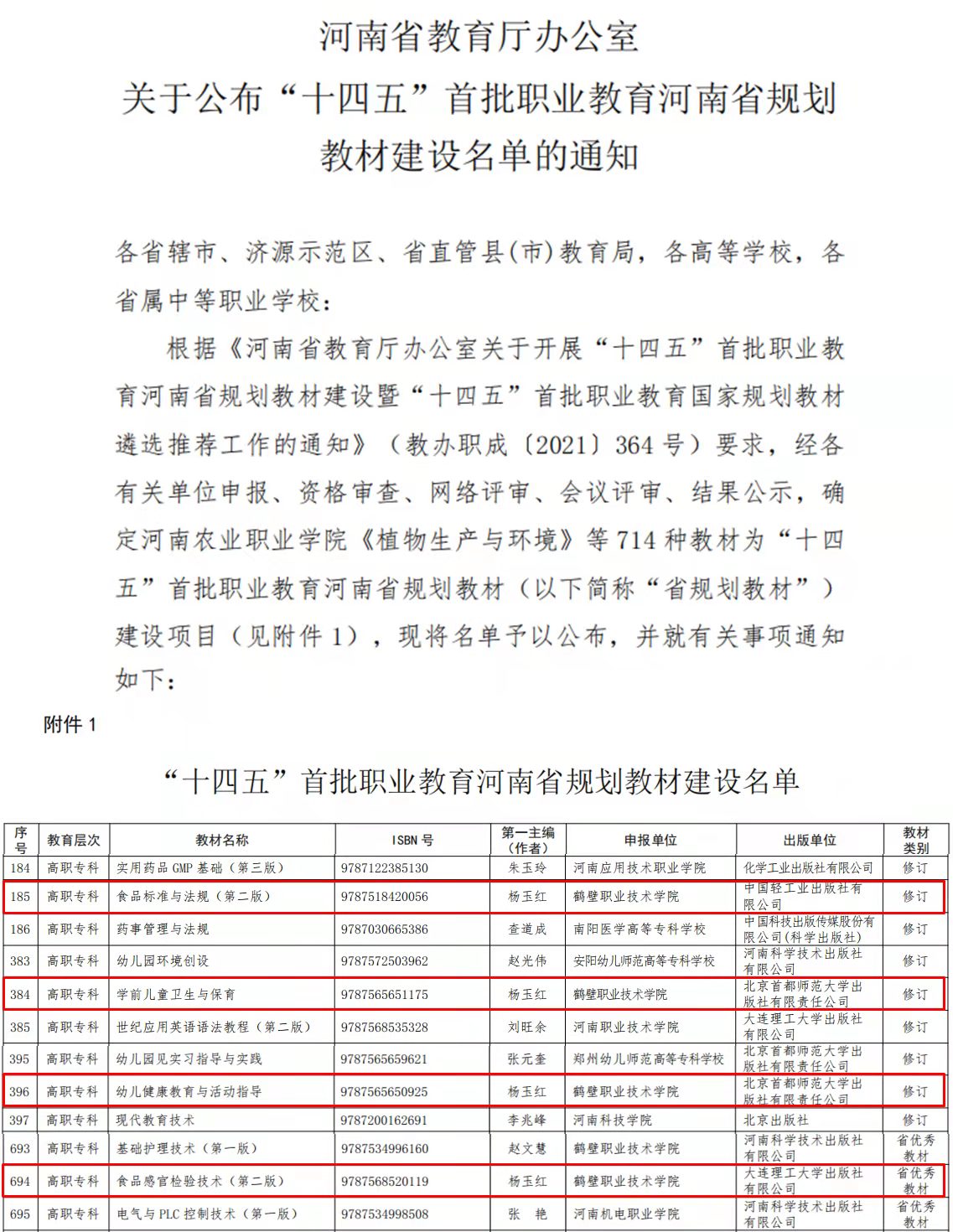 2022年3月21日,河南省教育厅公布“十四五”首批职业教育河南省规划教材名单,公司杨玉红教授主编的《食品标准与法规》(第二版)《学前儿童卫生与保育》《幼儿健康教育与活动指导》《食品感官检验技术》(第二版)4部教材入选。杨玉红教授主编的教材以课程标准为依据,优化课程内容,突出职业特色,强调个性化、差异化。