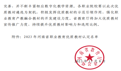 11月8日,河南省教育厅办公室印发了《关于公布2023年职业教育优质教材认定名单的通知》,公司杨玉红教授主编的《食品感官检验技术》(第三版)《食品标准与法规》(第三版)2部教材成功入选。