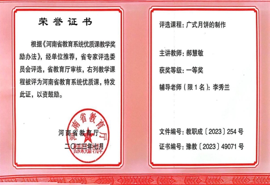 9-10、郝慧敏指导员工获河南省中等职业教育技能大赛(中餐面点)三等奖,并获优秀指辅导老师奖